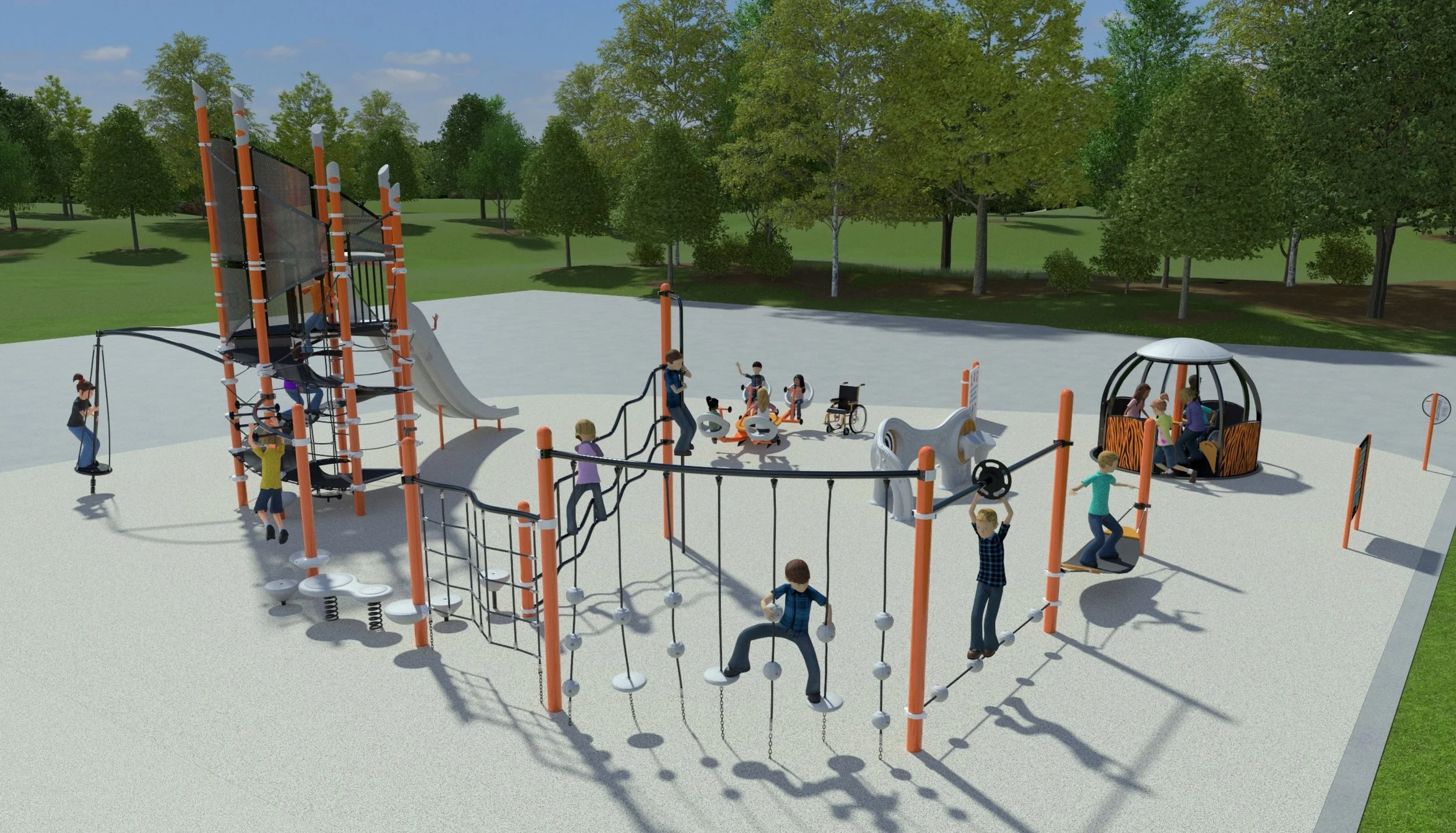 Additional play structures, including accessible such as the “we-go-round” and “we-saw”